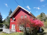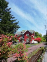 ペンション高原の小枝のツツジが真っ赤に咲いています。新緑がとてもきれいです。日光霧降高原のドライブ🎶🚗💨🎶とってもいいですよ!